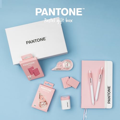 PANTONE™ Pastel Gift Box – Set Cancelleria con Temperino con Serbatoio, Taccuino Appunti, 2 Gomme da Cancellare, Bianchetto a Nastro 10mt e Penne Gel Nere 0.7 mm, Prodotti Cartoleria per Idee Regalo