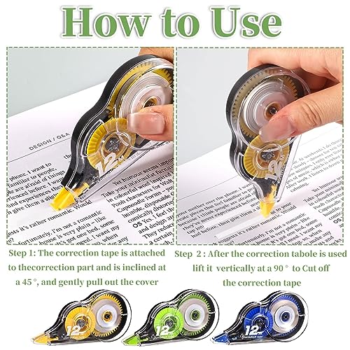 CARATTERISTICHE: SET DA 12 PEZZI – Il bianchetto roller è disponibile in 3 colori, giallo, verde e blu, carino ed elegante, 4 pezzi per ogni colore, 12 pezzi in totale. Ogni rullo include un nastro lungo 12 me largo 5 mm.