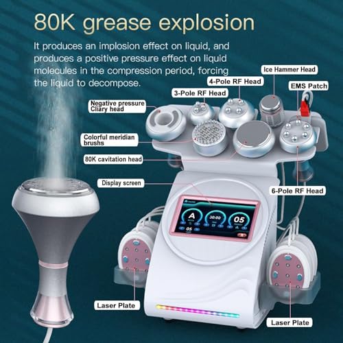 CARATTERISTICHE: ✔ Testa di cavitazione forte da 80 KHz: la macchina dimagrante per cavitazione ultrasonica 80K può raggiungere il grasso in profondità nella pelle, rompere le cellule di grasso istantaneamente e con forza, sciogliere il grasso, drenaggio linfatico, migliorare la circolazione sanguigna, accelerare la decomposizione del grasso, consentire di mantenere un corpo snello figura.