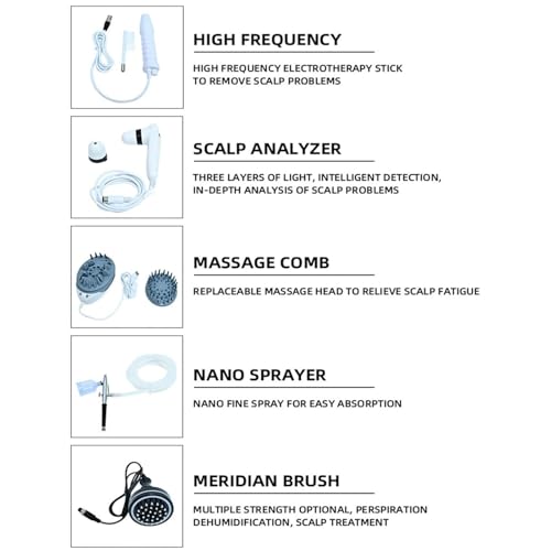 ▶【Piano personalizzato】: in base ai risultati del test, viene creato un piano di cura personalizzato della pelle e del cuoio capelluto e vengono consigliati prodotti e metodi di cura adatti al tipo di pelle e cuoio capelluto. La macchina ha 5 maniglie funzionali (ALTA FREQUENZA, ANALIZZATORE DEL CUOIO CAPELLUTO, PETTINE PER MASSAGGIO, NANO SPRAYER, SPAZZOLA MERIDIAN)