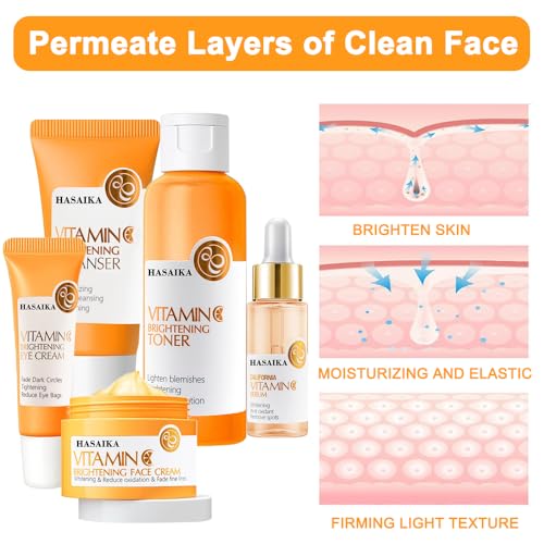 Set per la cura del viso: Il set di 5 pezzi per la cura della pelle alla vitamina C comprende detergente, tonico, siero per il viso, siero per gli occhi e crema. Migliora efficacemente la pelle danneggiata, schiarisce il tono della pelle pallida, previene l’iperpigmentazione, riduce le rughe, schiarisce le occhiaie e minimizza i pori.