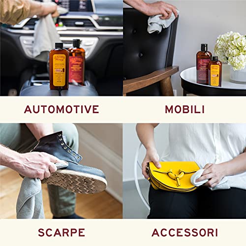 PULISCE TUTTA LA PELLE, ANCHE ECOPELLE/VINILE: Elimina velocemente e con delicatezza sporco, untuosità, macchie difficili e impurità dal tuo divano pelle, sedili di auto e camion, arredi imbottiti, scarpe, portafogli e borse in pelle, giacche, accessori, fondine, guanti da lavoro, abbigliamento moto, selle e finimenti. Efficace per la pulizia di pelle nuova e vecchia di tutti i colori, compresa pelle nera, pelle bianca, pelle marrone, pelle rossa e pelle gialla. Sicuro anche su pellami esotici