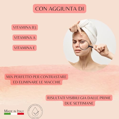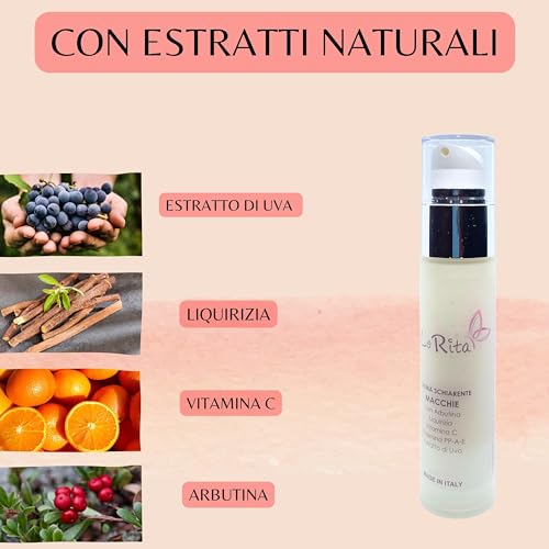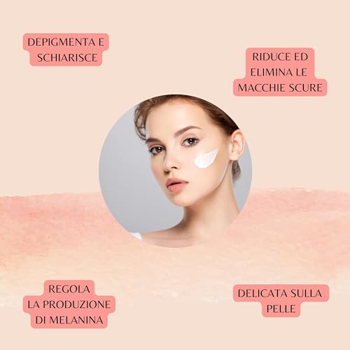 CARATTERISTICHE: ✅MIX MAGICO – Questa crema viso idratante Made in Italy è formulata con arbutina, liquirizia e vitamina C per schiarire le macchie scure. Le vitamine PP, A ed E migliorano l’elasticità e idratazione, mentre l’estratto d’uva fornisce protezione antiossidante. Ottieni una pelle più luminosa e uniforme!