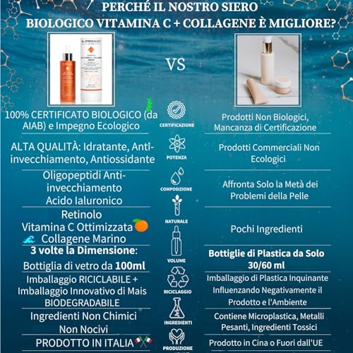 CARATTERISTICHE: 🌿 ECCELLENZA BIOLOGICA & ECO-IMPEGNO: Prodotti Dr. Dermaluci LAB: fusione di qualità e responsabilità. Certificati BIO 100% da AIAB, fatti con orgoglio in Italia 🇮🇹. Bottiglia di vetro riciclabile 100 ML e packaging innovativo biodegradabile di mais. Senza sostanze nocive, microplastiche o ingredienti tossici.