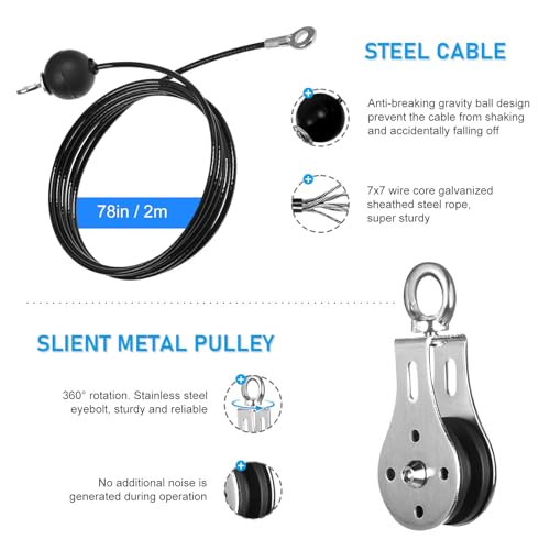 【Materiali Professionali】Puleggia per cavi da palestra realizzata con cavo d’acciaio di buona qualità, perno esteso di 38 cm in grado di sostenere più pesi, il carico massimo è di 300 libbre. Puleggia palestra è dotato di pulley silenziose, nessun rumore durante il funzionamento.