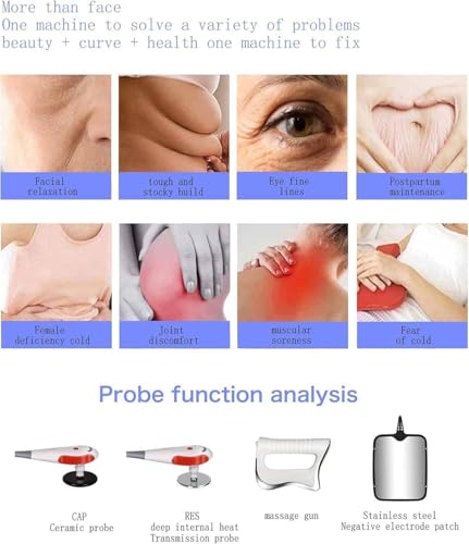 CARATTERISTICHE: ✔【Macchina per trattamenti Deep Care a 448 KHz】: la corrente termica a 448 KHz attiva le cellule per generare energia termica, favorisce la circolazione sanguigna e linfatica, può ripristinare l’elasticità della pelle, rassodarla, favorire il grasso sottocutaneo, migliorare l’organizzazione cellulare, migliorare la forma fisica e favorire la ricostruzione dei tessuti. 4 tipi di sonde possono trattare il grasso e il dolore in diverse parti del corpo e alleviare efficacemente l’affaticamento.