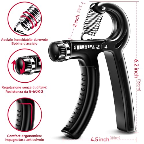 CARATTERISTICHE: 𝗔𝗗𝗔𝗧𝗧𝗢 𝗔 𝗧𝗨𝗧𝗧𝗜 — Il hand grip è perfetto per migliorare la forza, la potenza e la velocità di polsi, dita e avambracci. Una scelta senza dubbio migliore per alpinisti, tennisti, atleti e musicisti per migliorare la flessibilità di dita e polsi.