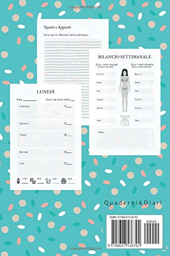 Questo diario di dieta offre un progetto di 8 settimane per la perdita di peso e la salute. La copertina flessibile misura 6×9″ ed è disponibile in lingua italiana. Ogni giorno, l’utente si impegna a compilare abitudini alimentari e attività fisiche. Il diario offre una struttura organizzata e guidata per assicurare un processo di perdita di peso efficace e sostenibile. L’utilizzo quotidiano di questo diario offre una struttura consapevole per raccogliere informazioni di riferimento sulla dietetica e sulla salute fisica.