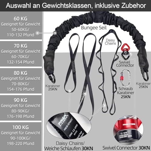 Bungee Fly Kit Dimensione: 1. S: 50-60 kg, adatto per peso 110-132 libbre. 2. M: 60 – 70 kg, adatto per peso 132 – 154 kg. 3. L: 70-80 kg, adatto per peso 154-176 kg. 4. XL: 80-90 kg, adatto per un peso di 176-198 libbre. 5. XXL: 90-100 kg, adatto per peso 198-220 kg.