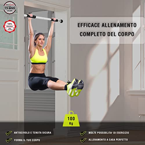 CARATTERISTICHE: Sbarra per sollevamento allargabile a 2 vie per il telaio porta – utilizzabile senza viti né fori: è sufficiente fissarla e allenarsi, per un fissaggio a lungo termine viti e materiale di montaggio sono in dotazione