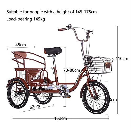 CARATTERISTICHE: Stabile e robusto: la bici a 3 ruote da 16 pollici è costruita con telaio in acciaio ad alto tenore di carbonio, la struttura a triangolo è progettata per una maggiore stabilità, dimensioni 152 * 62 * 110 cm, portante 145 kg, adatta per altezza 145-175 cm; Doppio sistema frenante.