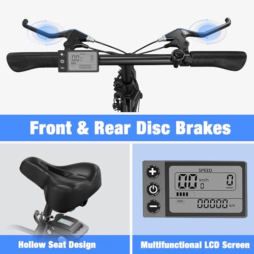 Sicurezza e funzionalità: Le luci anteriori e posteriori luminose ti consentono di guidare comodamente di notte. I freni a disco anteriori e posteriori garantiscono sicurezza. Il sedile è cavo progettato per evitare l’accumulo di acqua. Il display LCD fornisce tutte le informazioni necessarie sulla bicicletta, tra cui velocità, livello di assistenza, distanza, carica della batteria e altro, puoi conoscere chiaramente lo stato della bicicletta