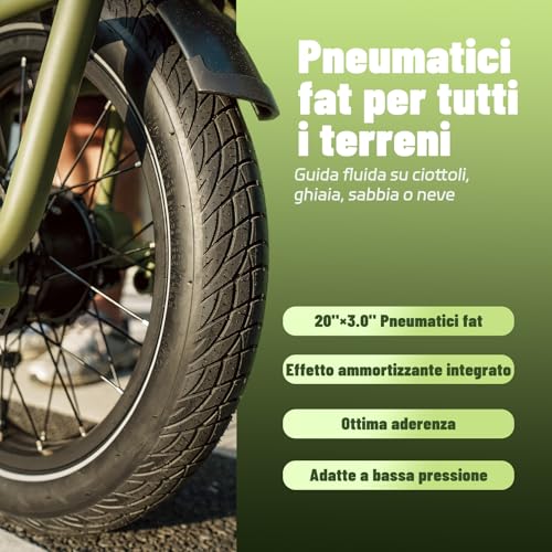 La sua struttura robusta e il telai in alluminio leggero garantiscono una resistenza a dovere. Inoltre, il suo caratteristico colore verde e le sue dimensioni 20″×3.0 Fat Tire, conferiscono un design moderno e accattivante. Le ruote spesse permettono una guida stabile e sicura anche su terreni accidentati, garantendo un’esperienza di marcia tranquilla anche lungo tragitto più lunghi.