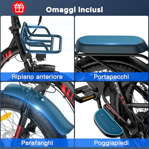 CARATTERISTICHE: 【Design Compatto e Versatile per Ogni Terreno】 La bici elettrica pieghevole FAFREES F20 MAX è dotata di pneumatici larghi 20″x4.0″, ideali per affrontare neve, sabbia, fango e strade sterrate. Il telaio in lega di alluminio pieghevole (95x50x75 cm da chiusa) e il design step-through la rendono perfetta per viaggi urbani, vacanze o avventure off-road.