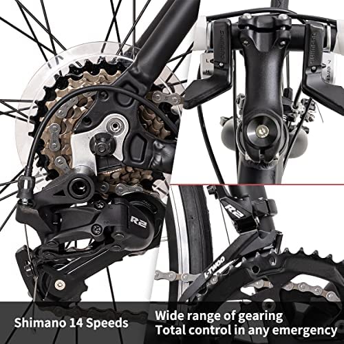 Azionamento professionale Shimano: la bici da corsa Hiland dispone di 14 marce con cambio a catena L-TWOO e leva del cambio SHIMANO, che offrono un’esperienza di guida versatile e garantiscono il controllo totale in ogni situazione, come ad esempio su ghiaia, strade cittadine o altri terreni difficili. Possono scivolare sulla maggior parte degli ostacoli senza perdere velocità o essere scosso troppo.
