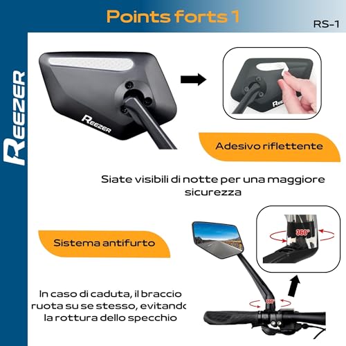 La particolarità principale del REEZER è la sua capacità di riflessione a 360° di sinistra, che offre un ampio campo visivo ai ciclisti e ai pedonali. Questo consente di percepire con facilità ogni eventuale ostacolo o veicolo che si trova dietro o a lato, permettendo di evitare collisioni e incidenti.