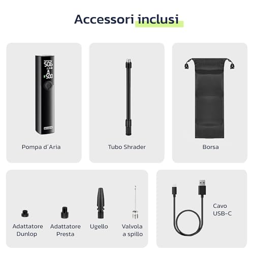 INCLUSO NELLA CONFEZIONE: Gonfiatore x1, tubo flessibile (valvola Schrader) x1, adattatore valvola Presta x1, adattatore valvola Dunlop x1, ugello per gonfiabili x1, ago per palloni x1, custodia x1, cavo di ricarica USB-C x1, manuale utente x1.