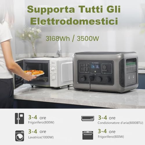 L’ALLPOWERS Centrale Elettrica Portatile R3500 presenta una combinazione impressiva di caratteristiche che la rendono una ottima scelta per una varieta di applicationi, sia domestiche che commerciali. Con un potenziale di 3500 Watt ed una capacità di batteria di 3168 Wh, tale generatore funziona grazie alla tecnologia LiFePO4 e offre quindi una qualità superiore e una elevata durata di vita per i cicli di ricarica ed utilizzazione.