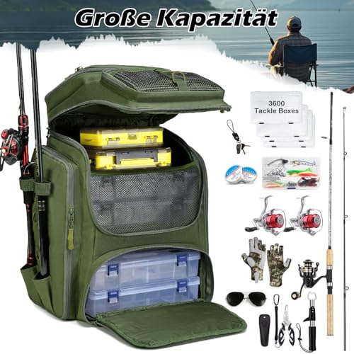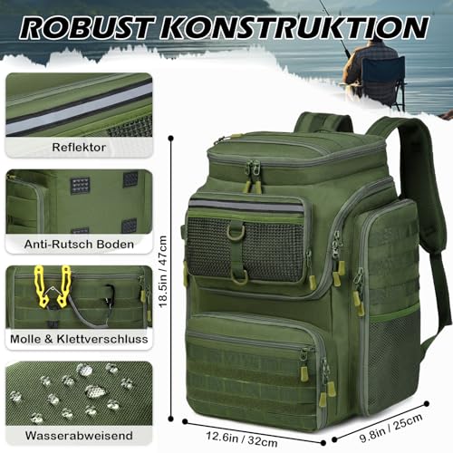 BlesMaller Zaino da Pesca con Portacanne Borsa per Attrezzi da Pesca Grande 45L Resistente all’Acqua Zaino tattico per Attrezzi da Pesca per Escursioni Campeggio Trekking Sport all’apert (Verde)