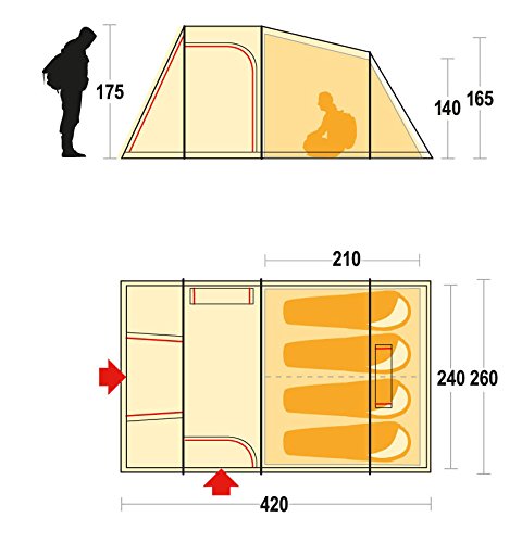 La tenda è dotata di un’area di vestibolo, che offre una superficie di stoccaggio per i bagagli e gli attrezzi. Inoltre, è dotata di un’area di cucina, che consente di preparare i pasti in modo pratico e comodo.