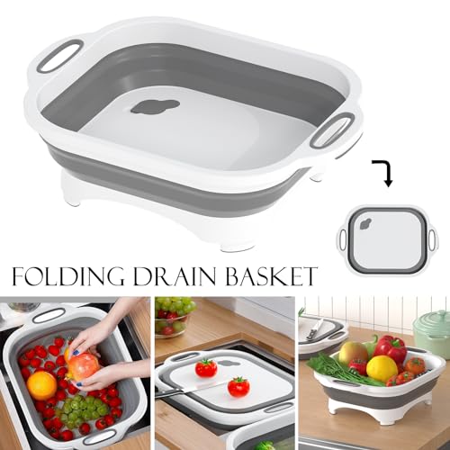 Gintan Tagliere da cucina pieghevole da campeggio, 3 in 1 multifunzione con coltello, tagliere con colino, può essere utilizzato per lavare e conservare frutta e verdura, lavandino campeggio (Grigio)