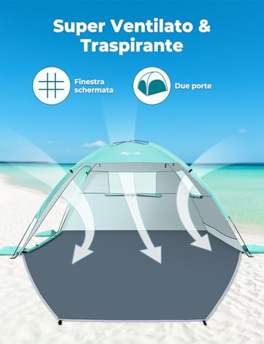 Glymnis Tenda da spiaggia adeguata a 2-4 persone offre la perfetta soluzione per quei giorni di riposo e divertimento sulla spiaggia durante le vacanze, o semplicemente come zona di rilassamento in un bellissimo posto di balneazione più vicino a casa. Si tratta di una tenda spiaggia portatile, leggera e man mano che diventa una parte insostituibile del pacchetto dei tuoi bagagli per usare sempre dove si possono trovare uno spazio di sabbia.