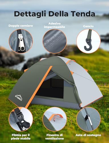 CARATTERISTICHE: [Antivento e Impermeabile] La tenda campeggio è realizzata in poliestere 210T, il corpo principale della tenda è impermeabile fino a 2000 mm e il pavimento è impermeabile fino a 3000 mm. È realizzato in tessuto Oxford addensato, che è più resistente. È inoltre dotato di corde antivento e chiodi a terra per rendere la tenda abbastanza stabile in caso di vento