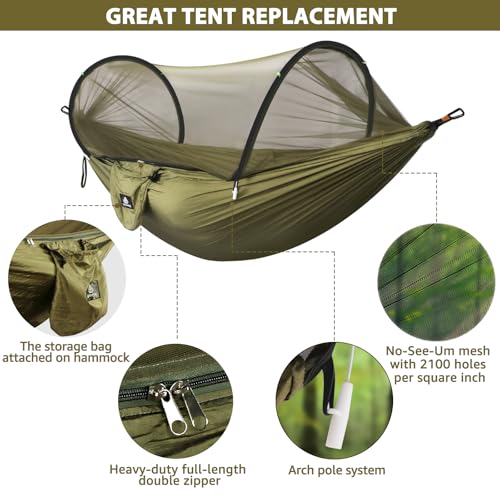 ►RESISTENTE PER VIAGGIARE, CAMPEGGIARE E ALLESTIRE CON FACILITÀ – Per l’accampamento, l’allestimento è un gioco da ragazzi grazie ai moschettoni in ferro inclusi ed alle cinghie ottimizzate per gli alberi. Grazie alle due cinghie da 2,8 metri, è possibile appendere l’amaca tra due alberi distanti oltre 6 metri. Non è mai necessario legare le corde per la zanzariera: nel momento in cui si estrae l’amaca dalla borsa, la rete si solleva automaticamente.