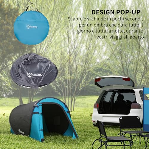 Questa tenda a cupola da camping Outsunny con 2 finestre e design pop-up a igloo presenta un’altezza totale di 220x108x110 cm ed è disponibile in un bel tono di blu.