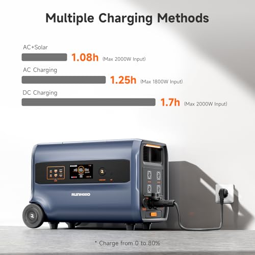 Il RUNHOOD F2400 Power Station è una stazione di potenza portatile da 2.4kWh, che offre una potenza di uscita di 2000W continua e 4000W di picco. Questa potenza elevata consente di caricare dispositivi elettronici di grande consumo, come computer, televisori e macchine da cucina, senza dover preoccuparsi della disponibilità di energia.