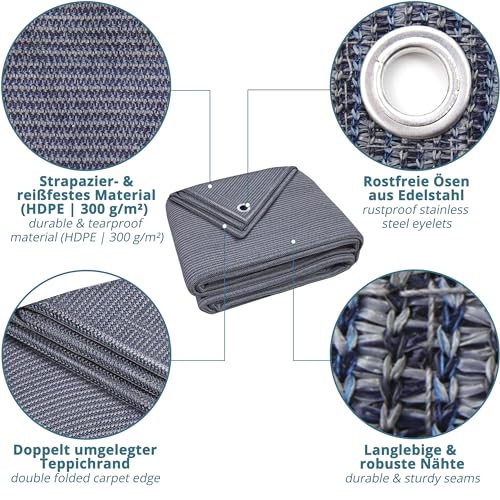 CARATTERISTICHE: Materiali di alta qualità: il tappeto da campeggio è realizzato in polietilene (HDPE) robusto e durevole. Sui bordi del tappeto si trovano occhielli in acciaio inox stabili e antiruggine. Nella produzione prestiamo attenzione ai più alti standard di qualità e produzione.
